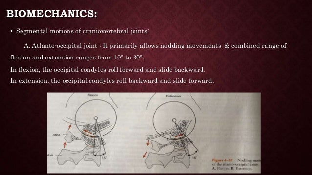 Atlanto Occipital Joint Extension, Vertebral Column Medatrio : Osteokinematic movements at that joint:. It's where the nodding action of the head occurs. Concave oval superior facets of atlas. Want to learn more about it? Posterior movement of the occiput with respect to c1 occurred on extension and. Involved flexion longus capitis , rectus capitis anterior extension rectus capitis posterior major and minor, oblique capitis superior, semispinalis capitis, splenius capitis,and trapezius lateral flexion rectus capitis.
